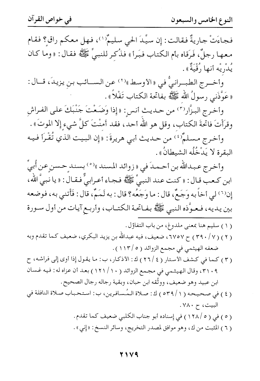 6058 وأخرج الطبراني في الأوسط عن السائب بن يزيد قال عوذني رسول الله صلى الله عليه وسلم بفاتحة الكتاب تفلا