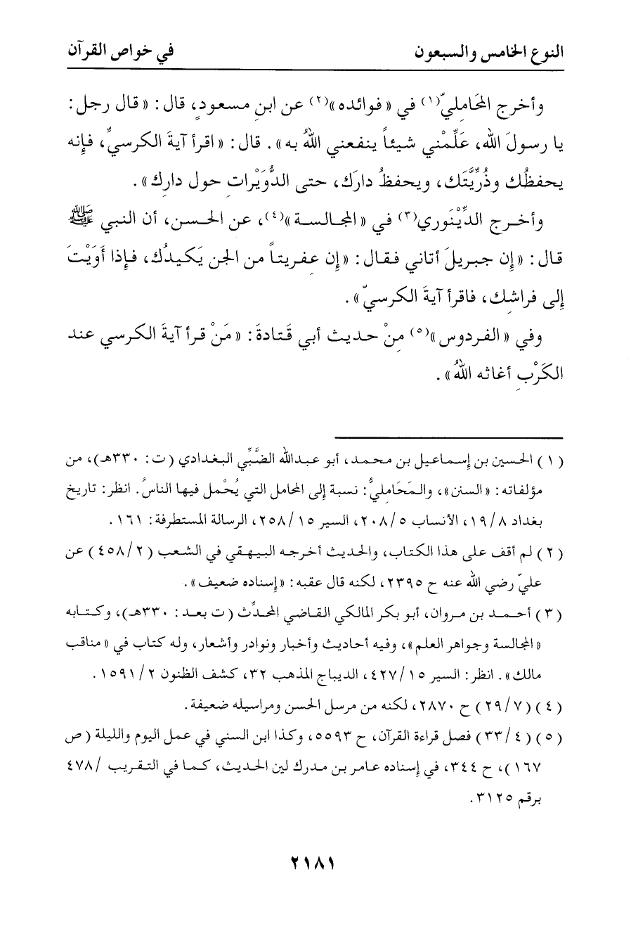 6064 وأخرج المحاملي في فوائده عن ابن مسعود قال قال رجل يا رسول الله علمني شيئا ينفعني الله به قال ( اقرأ آية الكرسي فإنه يحفظك وذريتك وحفظ دارك حتى الدويرات حول دارك )