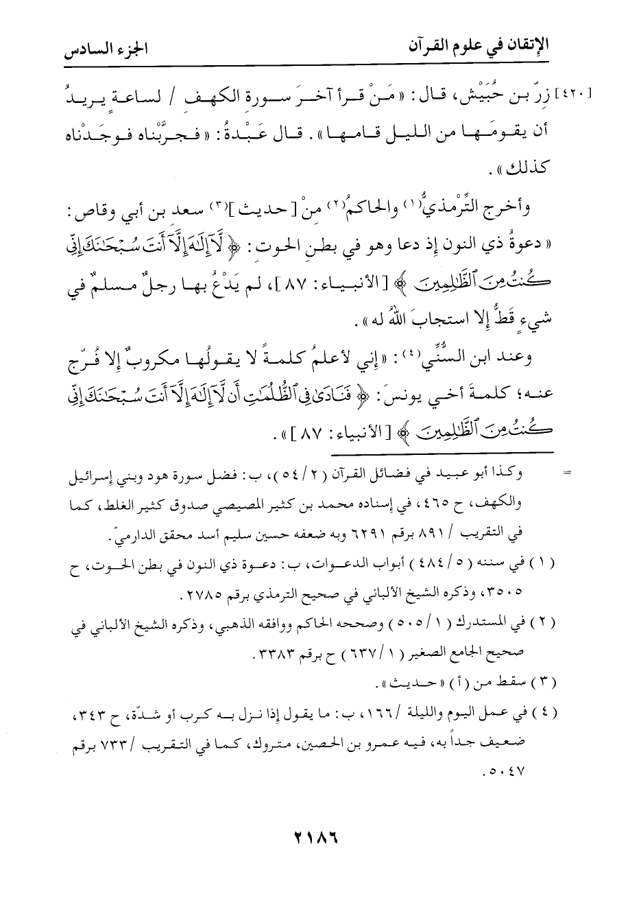 6080 وأخرج الترمذي والحاكم عن سعد بن أبي وقاص ( دعوة ذي النون إذ دعا وهو في بطن الحوت { لا إله إلا أنت سبحانك إني كنت من الظالمين } لم يدع بها رجل مسلم في شيء إلا استجاب الله له