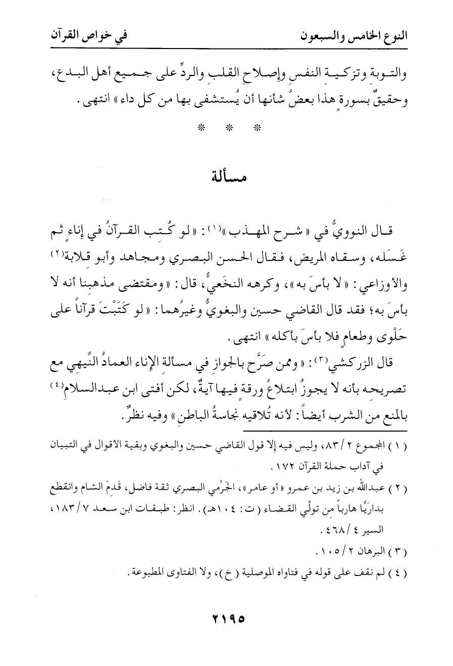6104 قال النووي في شرح المهذب لو كتب القرآن في إناء ثم غسله وسقاه المريض فقال الحسن البصري ومجاهد وأبو قلابة والأوزاعي لا بأس به وكرهه