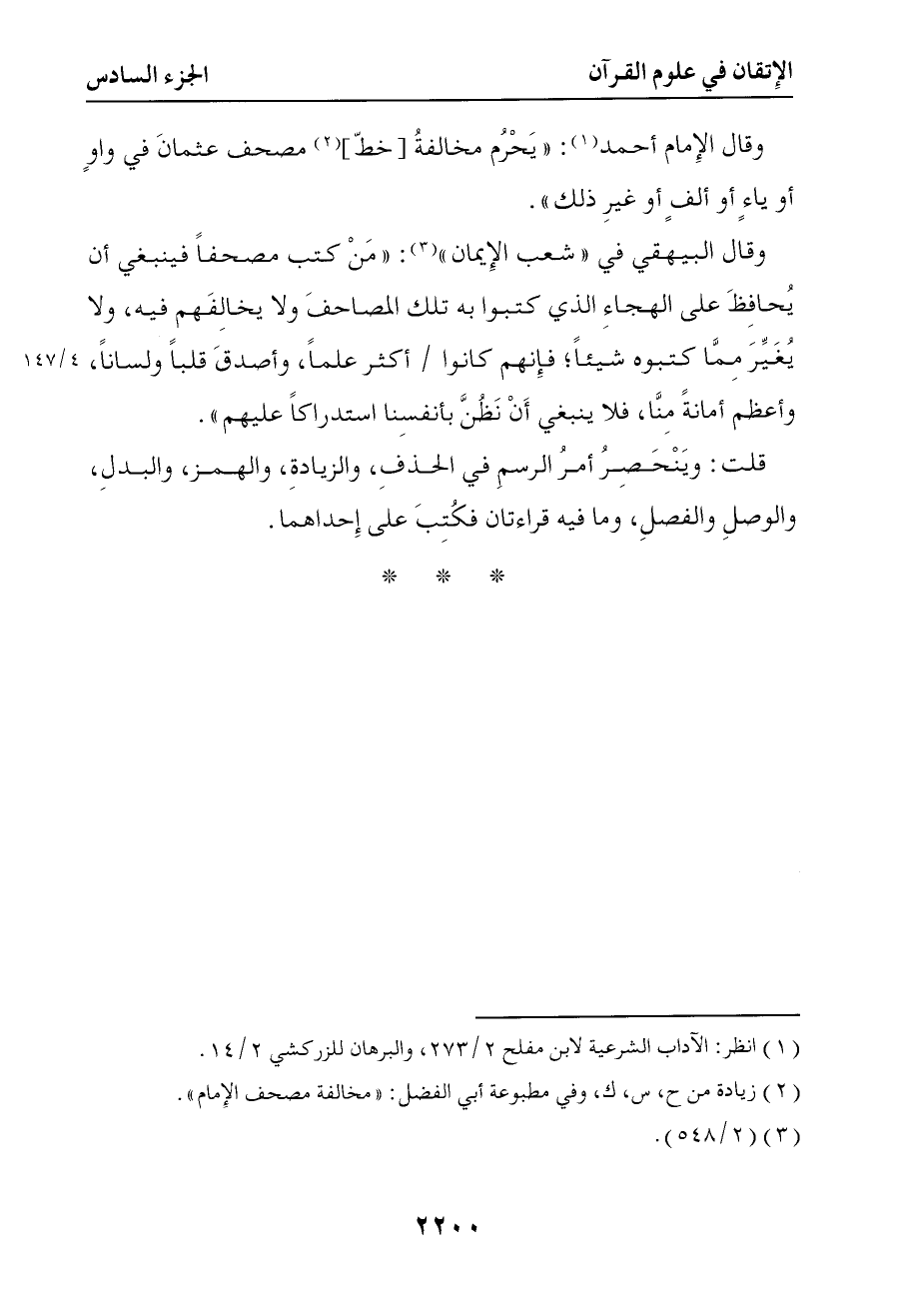 6117 وقال البيهقي في شعب الإيمان من كتب مصحفا فينبغي أن يحافظ على الهجاء الذي كتبوا به هذه المصاحف ولا يخالفهم فيه ولا يغير مما كتبوه شيئا فإنهم كانوا أكثر علما وأصدق قلبا ولسانا وأعظم أمانة منا فلا ينبغي أن يظن بأنفسنا استدراكا عليهم