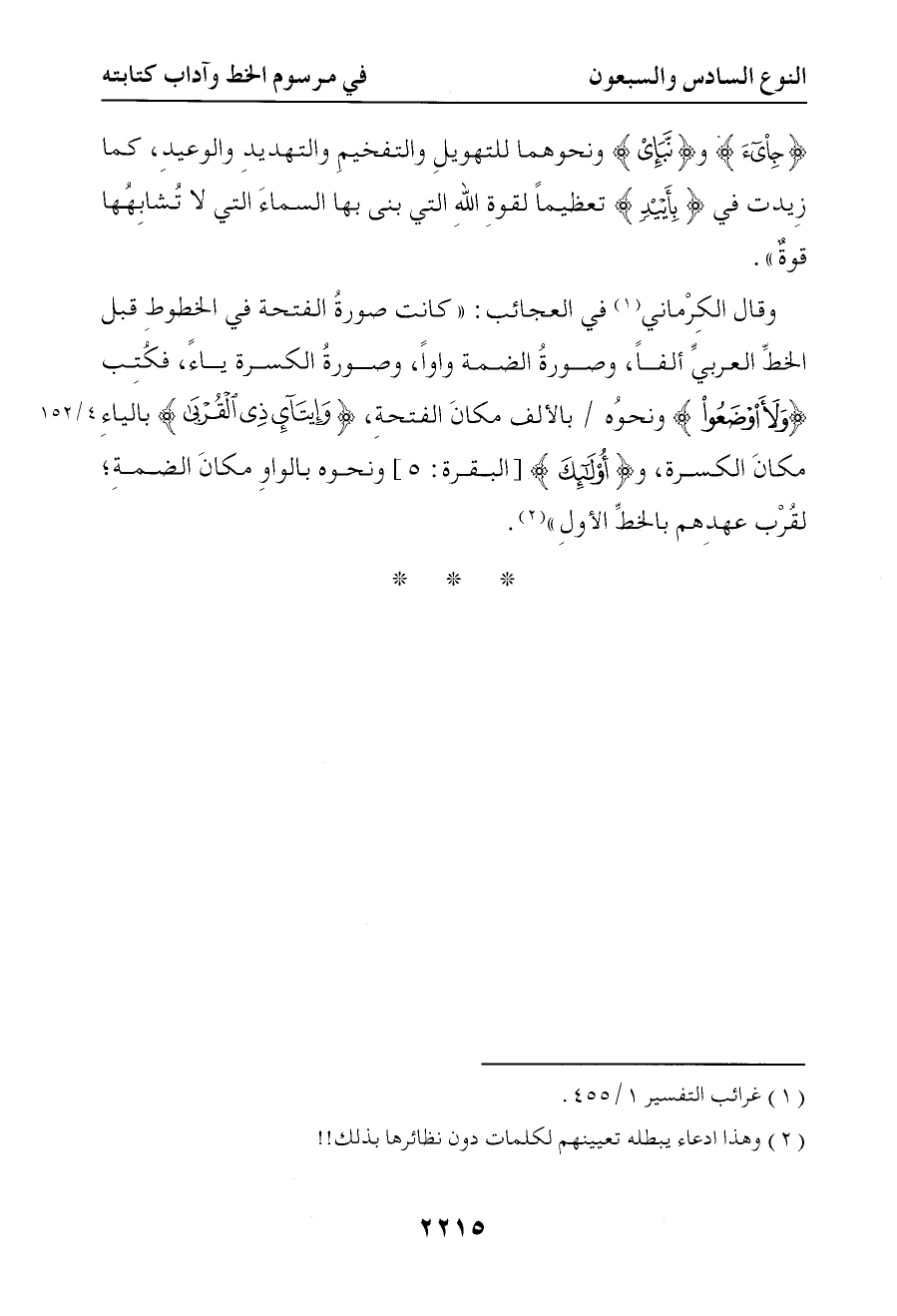 6147 وقال الكرماني في العجائب كانت صورة الفتحة في الخطوط قبل الخط العربي ألفا وصورة الضمة واوا وصورة الكسرة ياء فكتبت ( لا أوضعوا ) ونحوه بالألف مكان الفتحة و ( إيتائي ذي القربى ) بالياء مكان الكسرة و ( أولئك ) ونحوه بالواو مكان الضمة لقرب عهدهم بالخط الأول