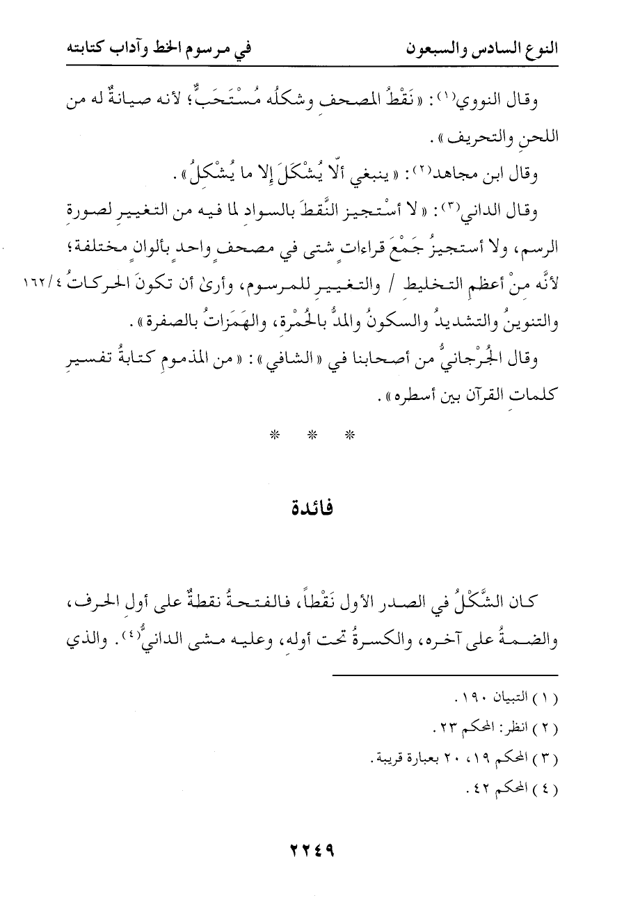6227 وقال الداني لا أستجيز النقط بالسواد لما فيه من التغيير لصورة الرسم ولا أستجيز جمع قراءات شتى في مصحف واحد بألوان مختلفة لأنه من أعظم التخليط والتغيير للمرسوم وأرى أن تكون الحركات والتنوين والتشديد والسكون والمد بالحمرة والهمزات بالصفرة