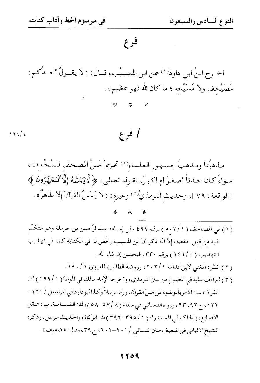 6253 روى ابن أبي داود عن ابن المسيب قال لا يقول أحدكم مصيحف ولا مسيجد ما كان لله تعالى فهو عظيم 8 - فرع