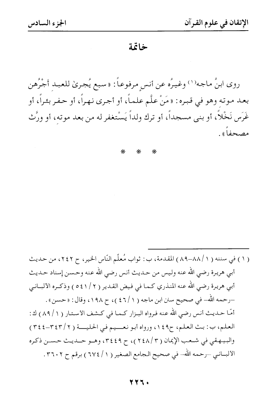 6255 روى ابن ماجه وغيره عن أنس مرفوعا ( سبع يجرى للعبد أجرهن بعد موته وهو في قبره من علم علما أو أجرى نهرا أو حفر بئرا أو غرس نخلا أو بنى مسجدا أو ترك ولدا يستغفر له من بعد موته أو ورث مصحفا