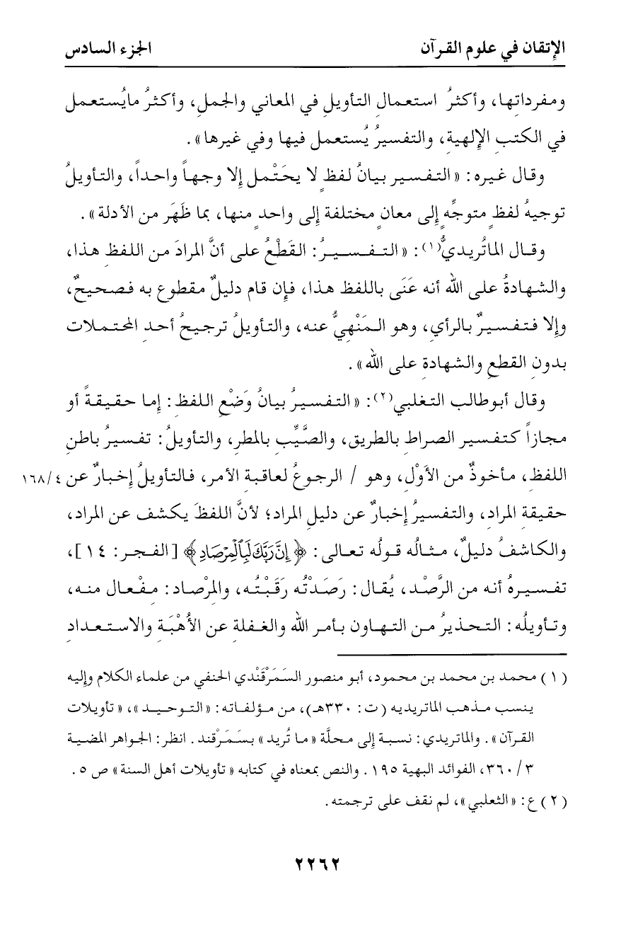 6259 وقال الماتريدي التفسير القطع على أن المراد من اللفظ هذا والشهادة على الله أنه عنى باللفظ هذا فإن قام دليل مقطوع به فصحيح وإلا فتفسير بالرأي وهو المنهى عنه والتأويل ترجيح أحد المحتملات بدون القطع والشهادة على الله