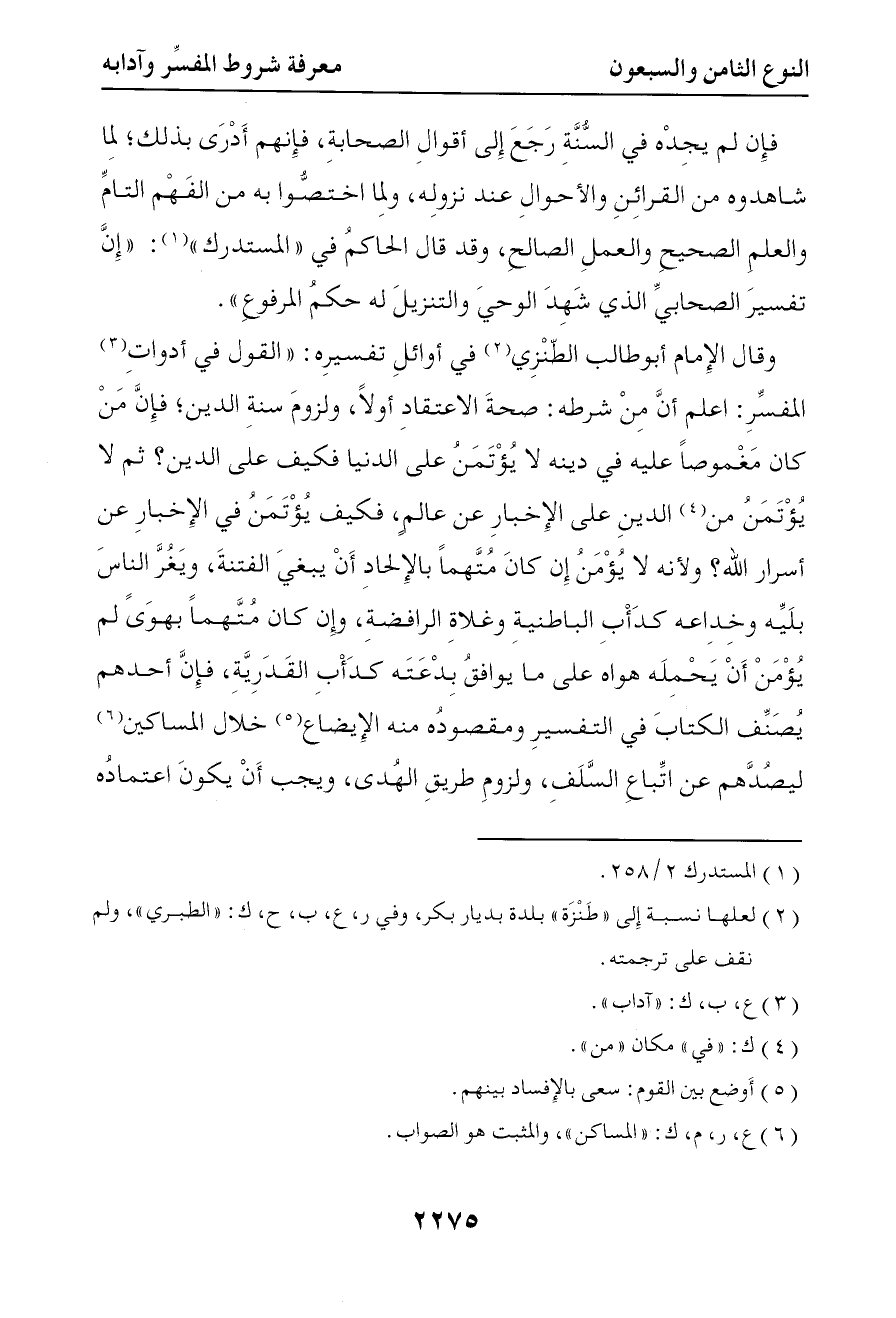 6287 وقال الإمام أبو طالب الطبري في أوائل تفسيره القول في أدوات المفسر اعلم أن من شرطه صحة الإعتقاد أولا ولزوم سنة الدين فإن من كان مغموصا عليه في دينه لا يؤتمن على الدنيا فكيف على الدين ثم لا يؤتمن من الدين على الإخبار عن عالم فكيف يؤتمن في الإخبار عن أسرار الله تعالى ولأنه لا يؤمن إن كان متهما بالإلحاد أن يبغي الفتنة ويغر الناس بليه وخداعه كدأب الباطنية وغلاة الرافضة وإن كان متهما بهوى لم يؤمن أن يحمله هواه على ما يوافق بدعته كدأب القدرية فإن أحدهم يصنف الكتاب في التفسير ومقصوده منه الإيضاح الساكن ليصدهم عن إتباع السلف ولزوم طريق الهدى