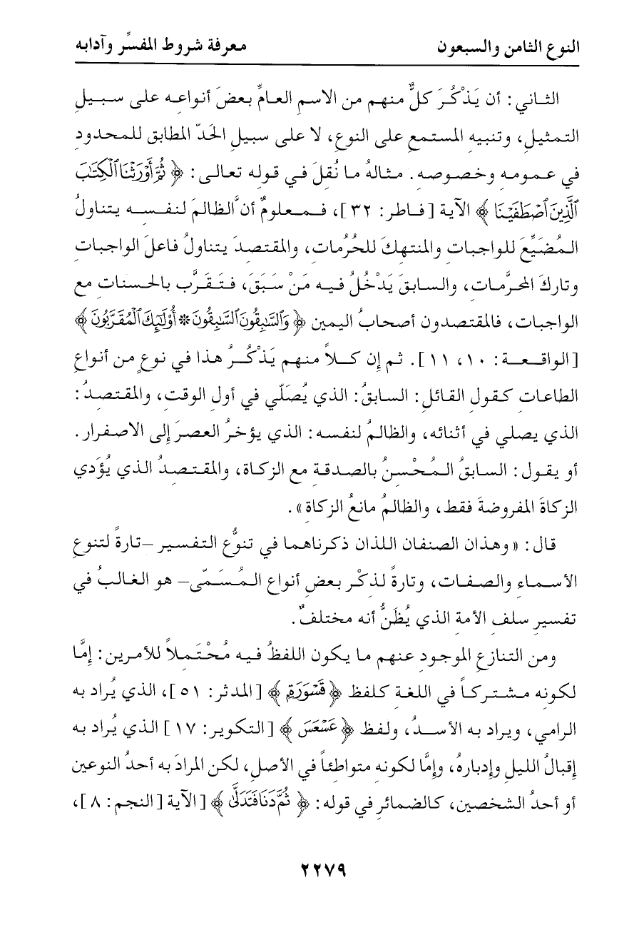 6292 الثاني أن يذكر كل منهم من الإسم العام بعض أنواعه على سبيل التمثيل وتنبيه المستمع على النوع لا على سبيل الحد المطابق للمحدود في عمومه وخصوصه مثاله ما نقل في قوله تعالى { ثم أورثنا الكتاب الذين اصطفينا } الآية فمعلوم أن الظالم لنفسه يتناول المضيع للواجبات والمنتهك للحرمات والمقتصد يتناول فاعل الواجبات وتارك المحرمات والسابق يدخل فيه من سبق فتقرب بالحسنات مع الواجبات فالمقتصدون أصحاب اليمين والسابقون السابقون أولئك المقربون