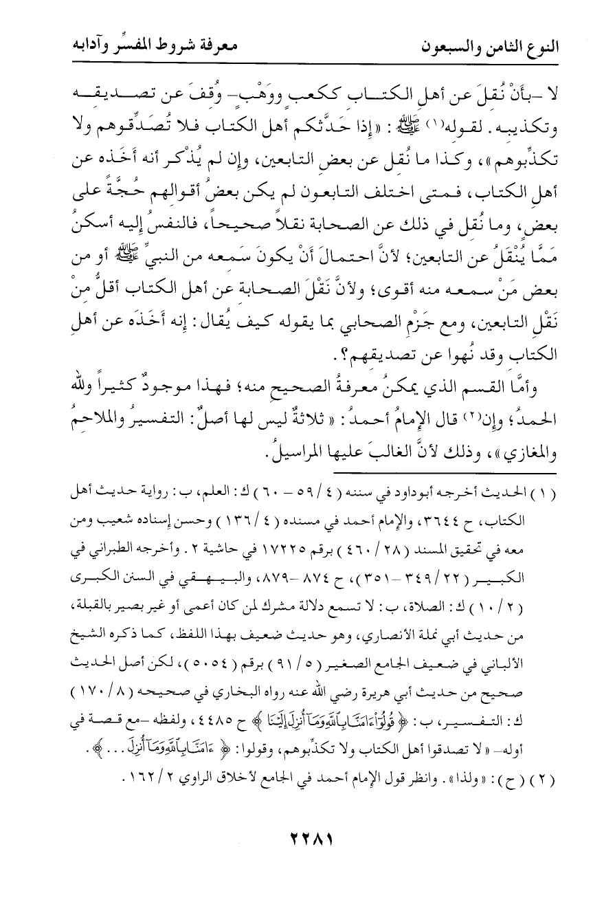 ومع جزم الصحابي بما يقوله كيف يقال إنه أخذه عن أهل الكتاب وقد نهوا عن تصديقهم وأما القسم الذي يمكن معرفة الصحيح منه فهذا موجود كثيرا ولله الحمد وإن قال الإمام أحمد ( ثلاثة ليس لها أصل التفسير والملاحم والمغازي ) وذلك لأن الغالب عليها المراسيل