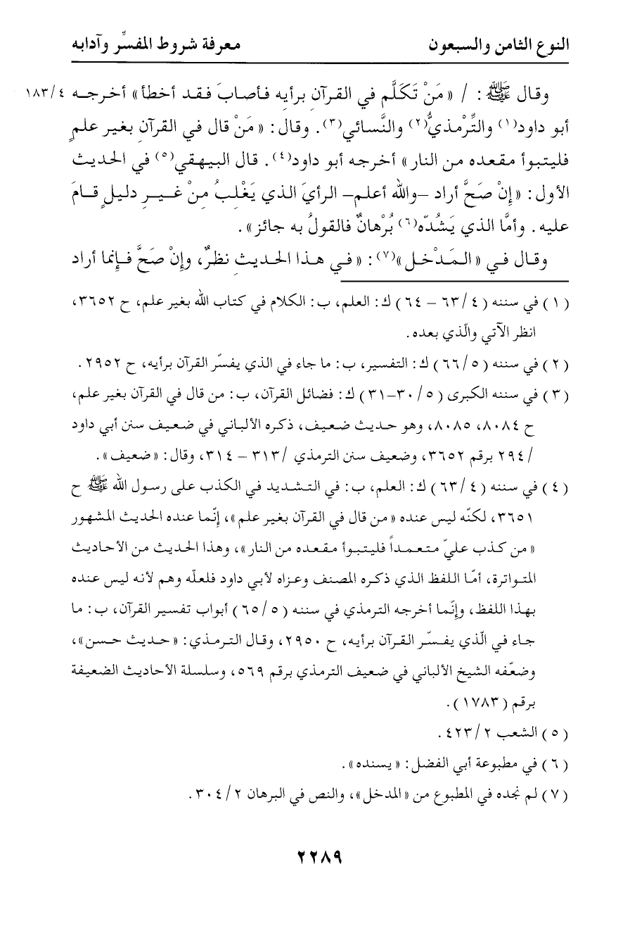 وقال صلى الله عليه وسلم ( من تكلم في القرآن برأيه فأصاب فقد أخطأ ) أخرجه أبو داود والترمذي والنسائي وقال ( من قال في القرآن بغير علم فليتبوأ مقعده من النار ) أخرجه أبو داود