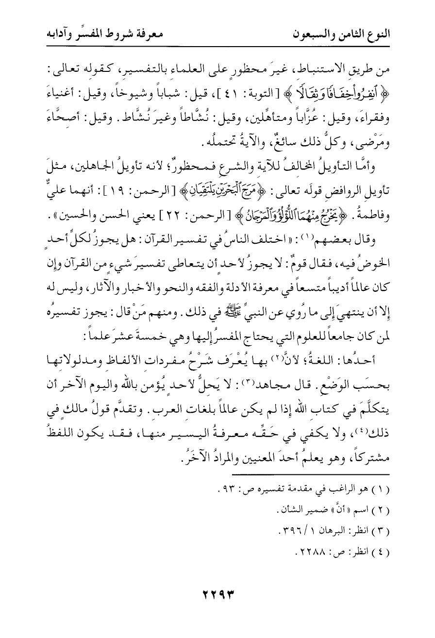 ومنهم من قال يجوز تفسيره لمن كان جامعا للعلوم التي يحتاج المفسر إليها وهي خمسة عشر علما