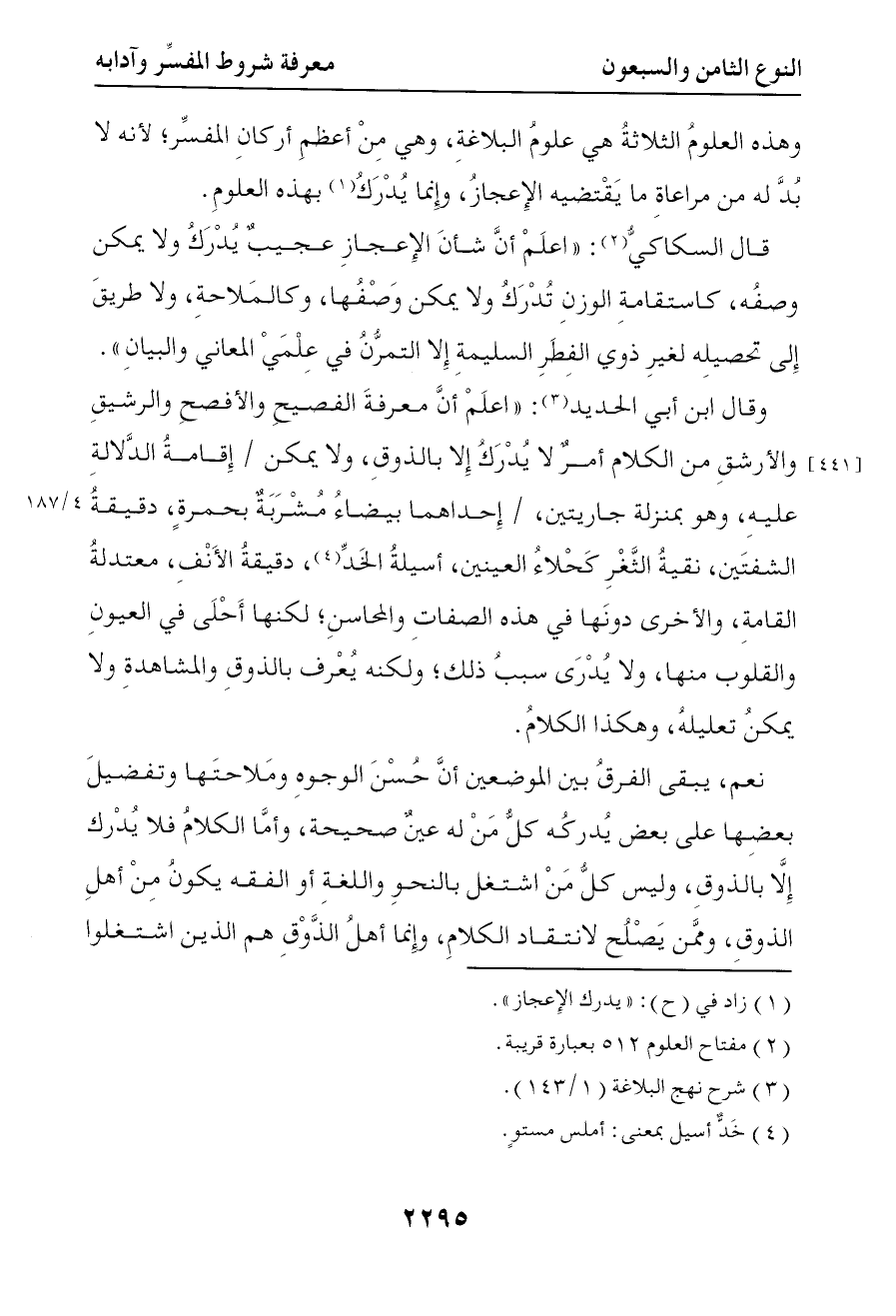 نعم يبقى الفرق بين الوصفين أن حسن الوجوه وملاحتها وتفضيل بعضها على بعض يدركه كل من له عين صحيحة وأما الكلام فلا يدرك إلا بالذوق وليس كل من إشتغل بالنحو واللغة والفقه يكون من أهل الذوق وممن يصلح لإنتقاد الكلام وإنما أهل الذوق هم الذين اشتغلوا