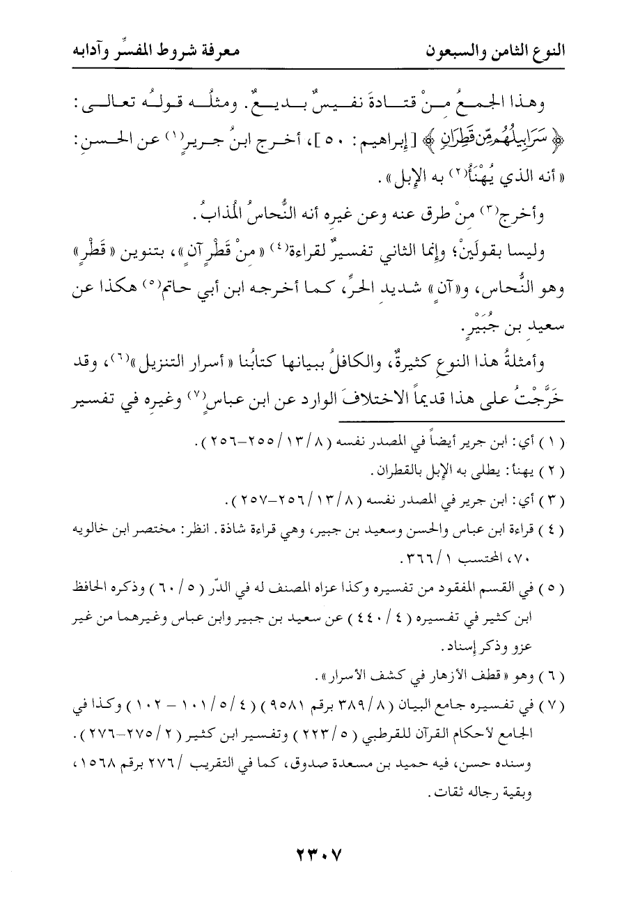 وأخرج من طرق عنه وعن غيره أنه النحاس المذاب وليسا بقولين وإنما الثاني تفسير لقراءة من ( قطرآن ) بتنوين ( قطر ) وهو النحاس و ( آن ) شديد الحر كما أخرجه ابن أبي حاتم هكذا عن سعيد بن جبير