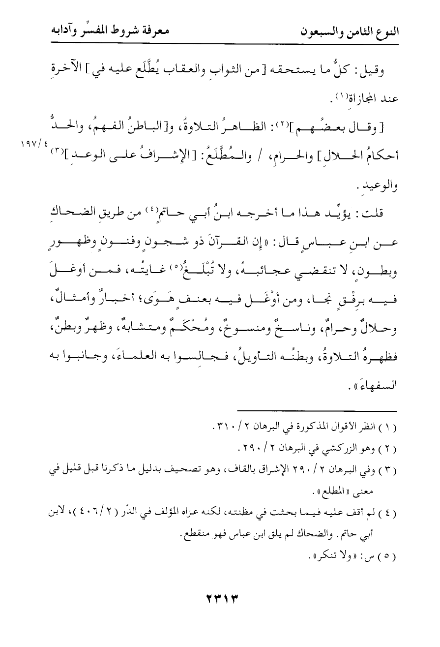 وقال بعضهم الظاهر التلاوة والباطن الفهم والحد أحكام الحلال والحرام والمطلع الإشراف على الوعد والوعيد