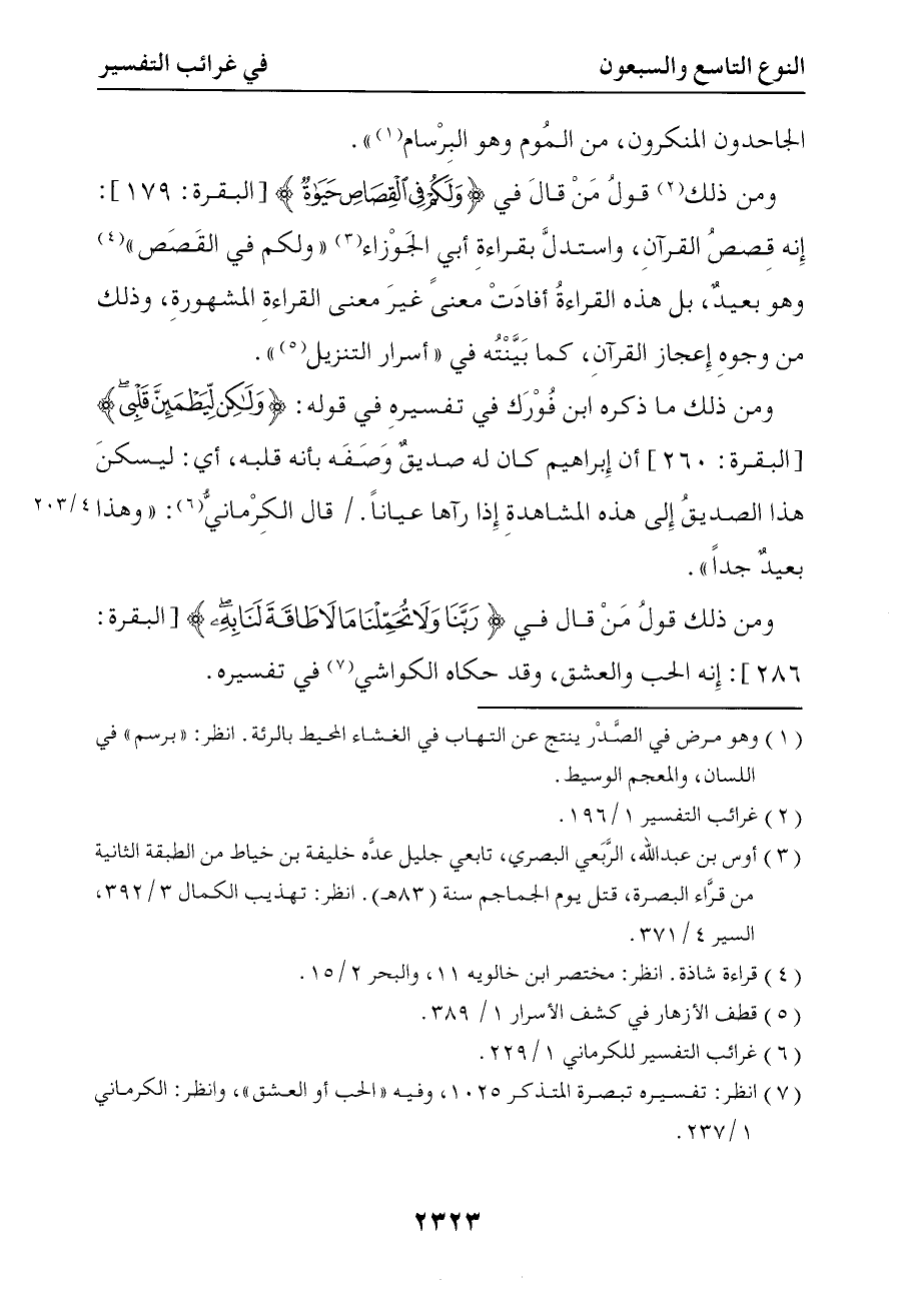 ومن ذلك قول من قال في { ولكم في القصاص حياة يا أولي الألباب } إنه قصص القرآن واستدل بقراءة أبي الجوزاء ولكم في القصص وهو بعيد بل هذه القراءة أفادت معنى غير معنى القراءة المشهورة وذلك من وجوه إعجاز القرآن كما بينته في أسرار التنزيل