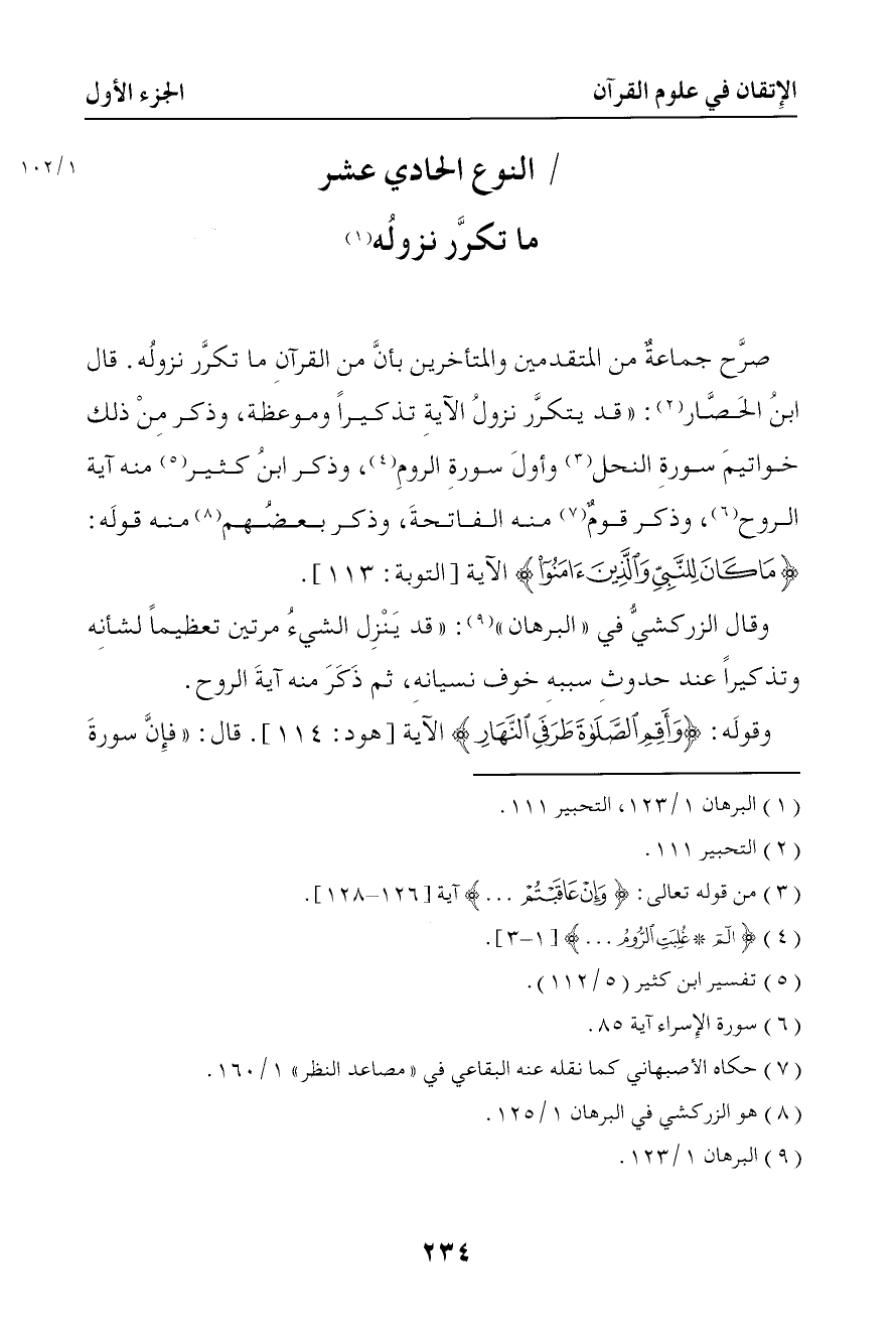 416 صرح جماعة من المتقدمين والمتأخرين بأن من القرآن ما تكرر نزوله قال ابن الحصار قد يتكرر نزول الآية تذكيرا وموعظة وذكر من ذلك خواتيم سورة النحل وأول سورة الروم