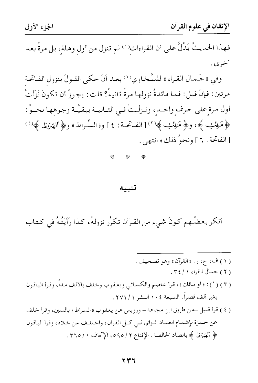 421 وفي جمال القراء للسخاوي بعد أن حكى القول بنزول الفاتحة مرتين إن قيل فما فائدة نزولها مرة ثانية قلت يجوز أن يكون نزلت أول مرة على حرف واحد ونزلت في الثانية ببقية وجوهها نحو ملك ومالك والسراط والصراط ونحو ذلك انتهى 2 - تنبيه
