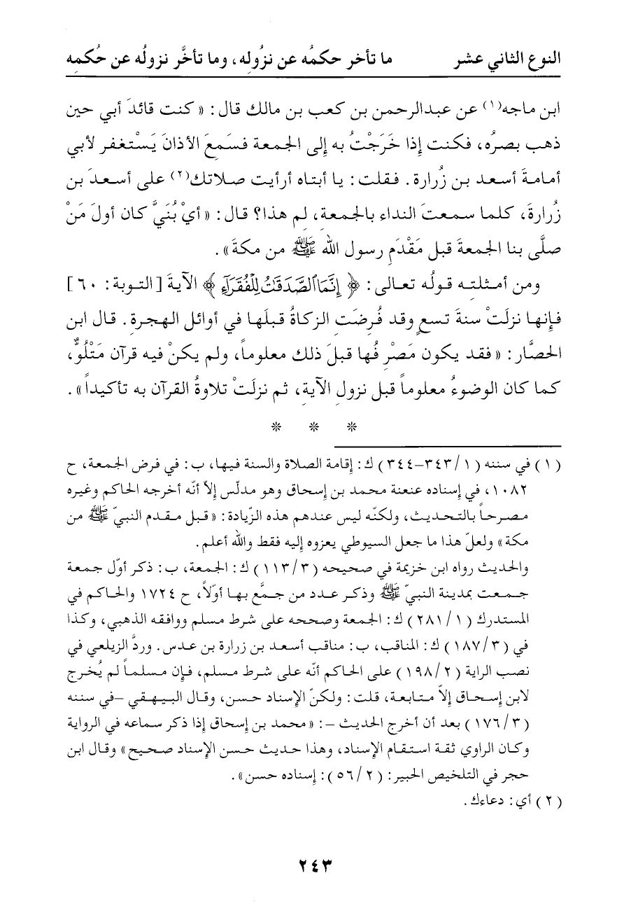 435 ومن أمثلته قوله تعالى { إنما الصدقات للفقراء } الآية فإنها نزلت سنة تسع وقد فرضت الزكاة قبلها في أوائل الهجرة