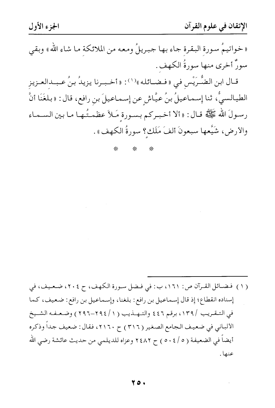 454 وبقي سور أخرى منها سورة الكهف قال ابن الضريس في فضائله أخبرنا يزيد بن عبد العزيز الطيالسي حدثنا إسماعيل بن عياش عن إسماعيل بن رافع قال بلغنا أن رسول الله صلى الله عليه وسلم قال ألا أخبركم بسورة ملء عظمتها ما بين السماء والأرض شيعها سبعون ألف ملك سورة الكهف