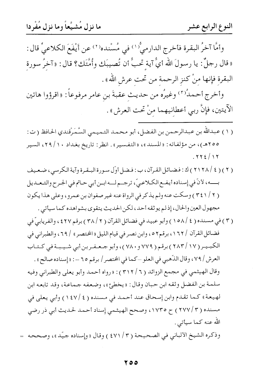 461 وأما آخر البقرة فأخرج الدارمي في مسنده عن أيفع الكلاعي قال قال رجل يا رسول الله أي آية تحب أن تصيبك وأمتك قال آخر سورة البقرة فإنها من كنز الرحمة من تحت عرش الله