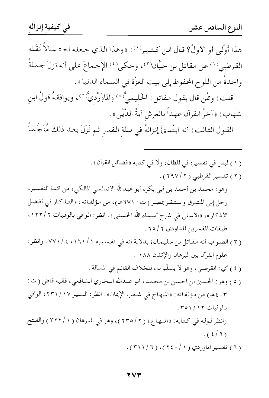 502 قال ابن كثير وهذا الذي جعله احتمالا نقله القرطبي عن مقاتل بن حيان وحكى الإجماع على أنه نزل جملة واحدة من اللوح المحفوظ إلى بيت العزة في السماء الدنيا