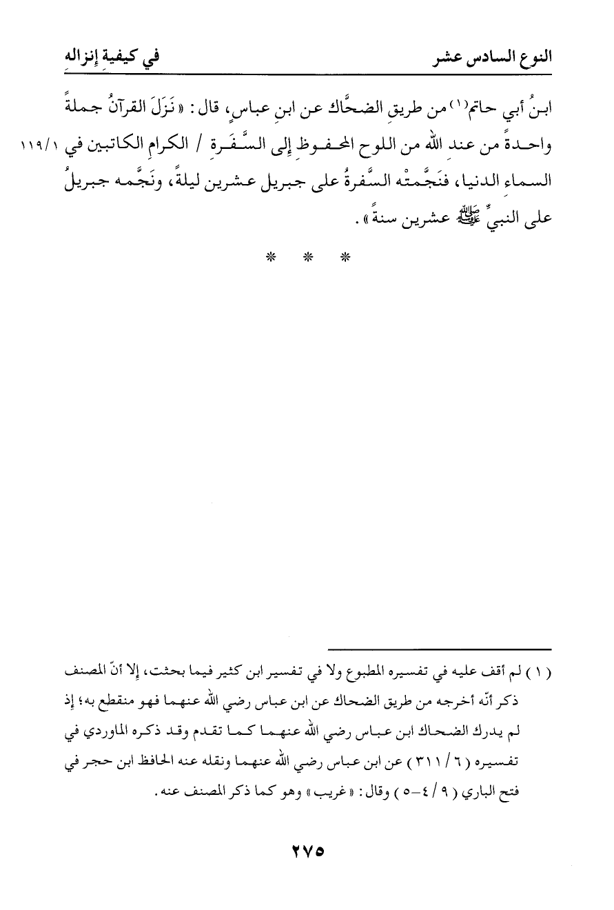 ابن أبي حاتم من طريق الضحاك عن ابن عباس قال نزل القرآن جملة واحدة من عند الله من اللوح المحفوظ إلى السفرة الكرام الكاتبين في السماء الدنيا فنجمته السفرة على جبريل عشرين ليلة ونجمه جبريل على النبي صلى الله عليه وسلم عشرين سنة