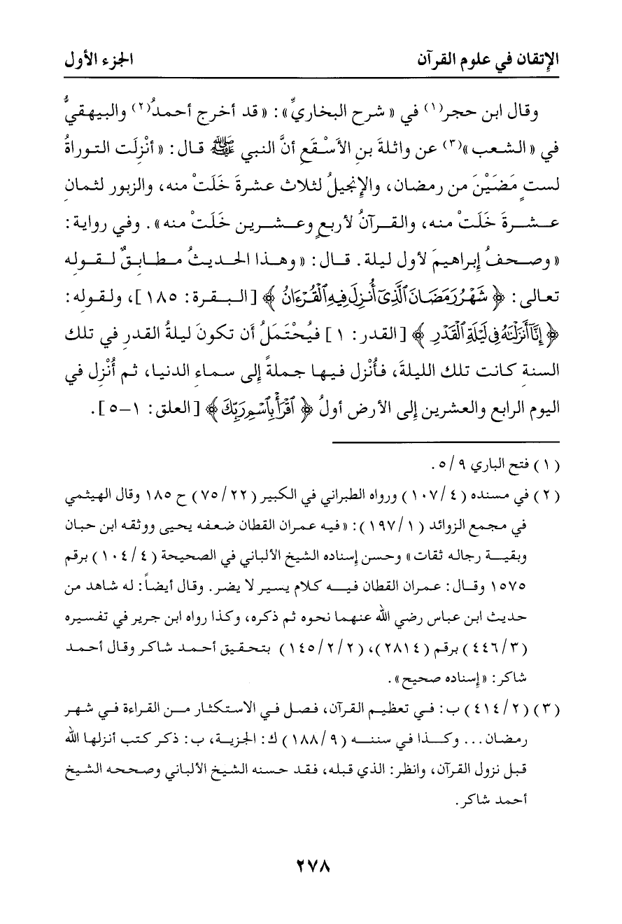 513 وقال ابن حجر في شرح البخاري قد أخرج أحمد والبيهقي في الشعب عن واثلة بن الأسقع أن النبي صلى الله عليه وسلم قال أنزلت التوراة لست مضين من رمضان والإنجيل لثلاث عشرة خلت منه والزبور لثمان عشرة خلت منه والقرآن لأربع وعشرين خلت منه وفي رواية وصحف إبراهيم لأول ليلة قال وهذا الحديث مطابق لقوله تعالى { شهر رمضان الذي أنزل فيه القرآن } ولقوله { إنا أنزلناه في ليلة القدر } فيحتمل أن يكون ليلة القدر في تلك السنة كانت الليلة فأنزل فيها جملة إلى سماء الدنيا ثم أنزل في اليوم الرابع والعشرين إلى الأرض أول { اقرأ باسم ربك