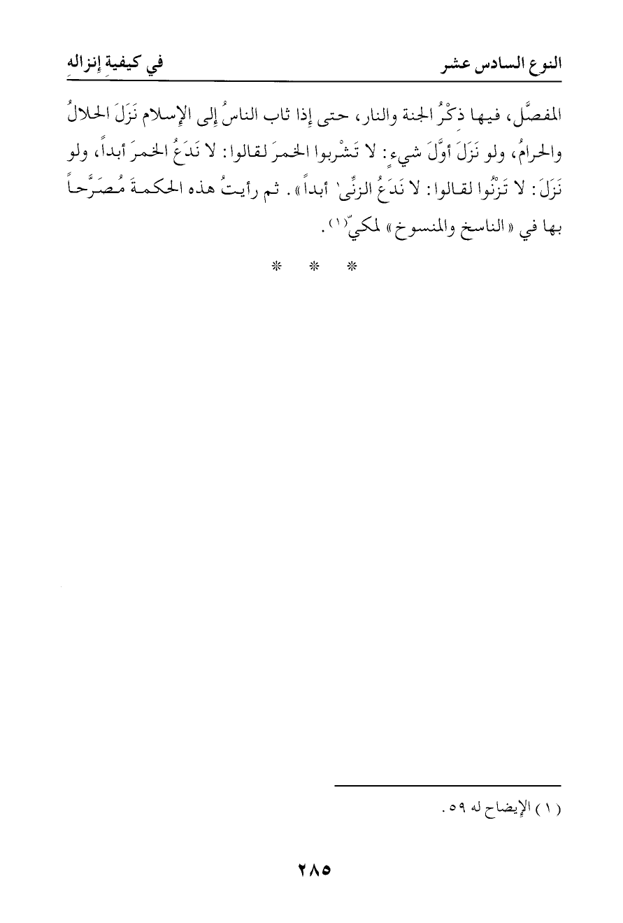 المفصل فيها ذكر الجنة والنار حتى إذا ثاب الناس إلى الإسلام نزل الحلال والحرام ولو نزل أول شيء لا تشربوا الخمر لقالوا لا ندع الخمر أبدا ولو نزل لا تزنوا لقالوا لا ندع الزنا أبدا ثم رأيت هذه الحكمة مصرحا بها في الناسخ والمنسوخ لمكي