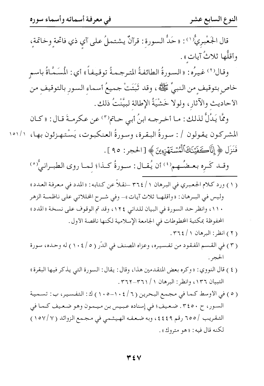 647 وقد ثبت جميع أسماء السور بالتوقيف من الأحاديث والآثار ولولا خشية الإطالة لبينت ذلك ومما يدل لذلك ما أخرجه ابن أبي حاتم عن عكرمة قال كان المشركون يقولون سورة البقرة وسورة العنكبوت يستهزئون بها فنزل { إنا كفيناك المستهزئين }