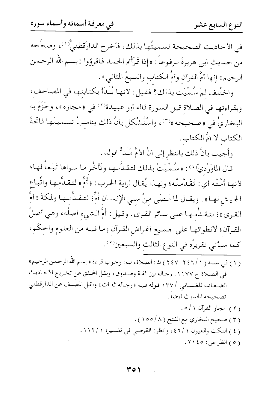 654 واختلف لم سميت بذلك فقيل لأنها يبدأ بكتابتها في المصاحف وبقراءتها في الصلاة قبل السورة قاله أبو عبيدة في مجازه وجزم به البخاري في صحيحه واستشكل بأن ذلك يناسب تسميتها فاتحة الكتاب لا أم الكتاب وأجيب بأن ذلك بالنظر إلى أن الأم مبتدأ الولد قال الماوردي سميت بذلك لتقدمها وتأخر ما سواها تبعا لها لأنها أمته أي تقدمته ولهذا يقال لراية الحرب أم لتقدمها وإتباع الجيش لها ويقال لما مضى من سني الإنسان أم لتقدمها ولمكة أم القرى لتقدمها على سائر القرى وقيل أم الشيء أصله وهي أصل القرآن لانطوائها على جميع أغراض القرآن وما فيه من العلوم والحكم كما سيأتي تقريره في النوع الثالث والسبعين