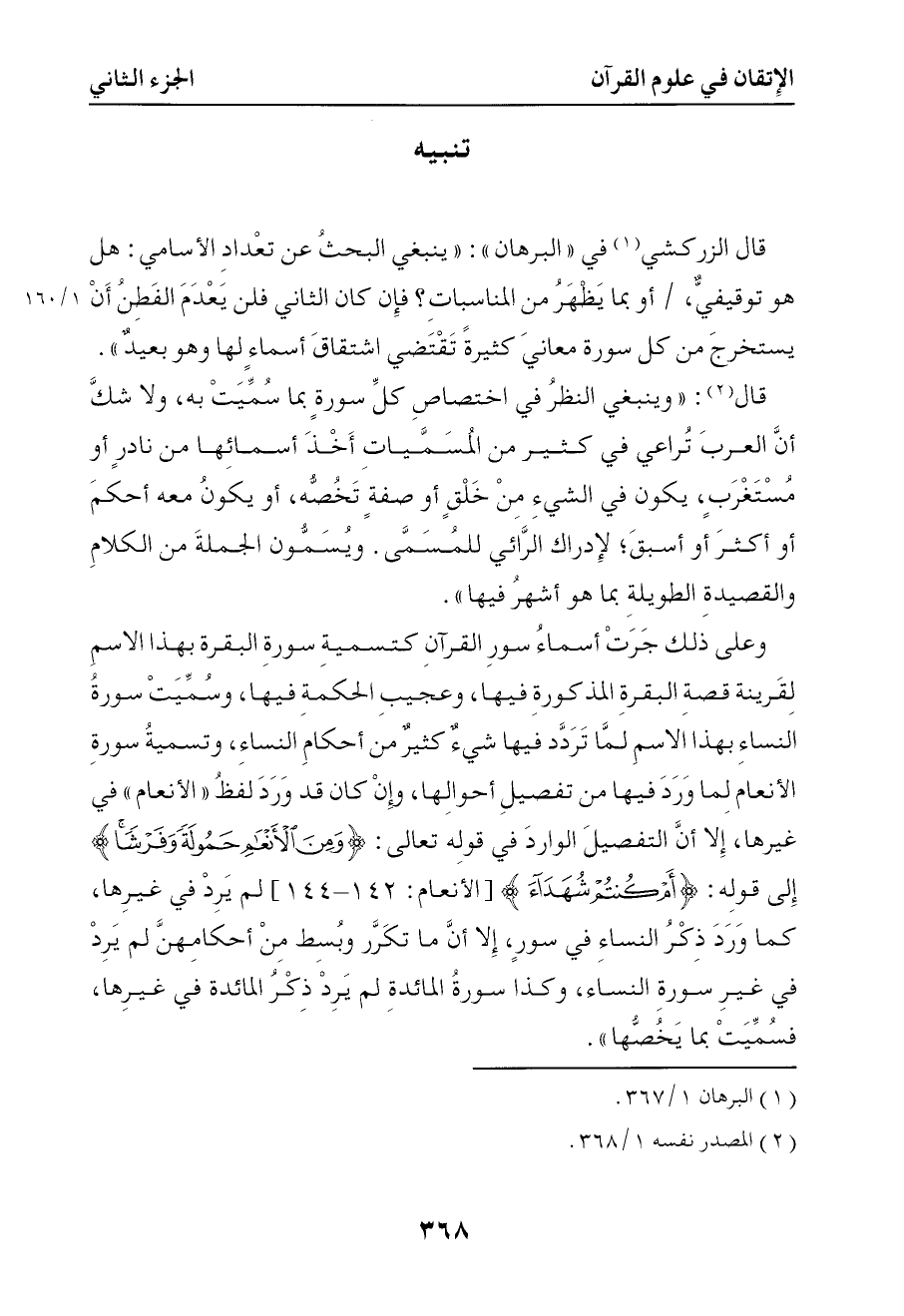 732 قال الزركشي في البرهان ينبغي البحث عن تعداد الأسامي هل هو توقيفي أو بما يظهر من المناسبات فإن كان الثاني فلم يعدم الفطن أن يستخرج من كل سورة معاني كثيرة تقتضي اشتقاق أسماء لها وهو بعيد