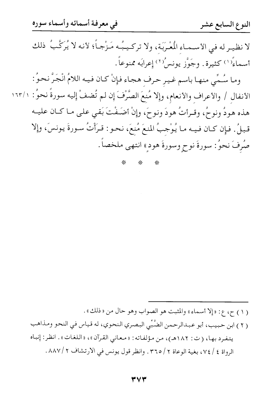 740 وما سمي منها باسم غير حرف الهجاء فإن كان فيه اللام انجر نحو الأنفال والأعراف والأنعام وإلا منع الصرف إن لم يضف إليه سورة نحو هذه هود ونوح وقرأت هود ونوح وإن أضفت بقي على ما كان عليه قبل فإن كان فيه ما يوجب المنع منع نحو قرأت سورة يونس وإلا صرف نحو سورة نوح وسورة هود انتهى ملخصا