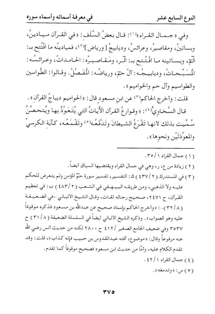 742 وفي جمال القراء قال بعض السلف في القرآن ميادين وبساتين