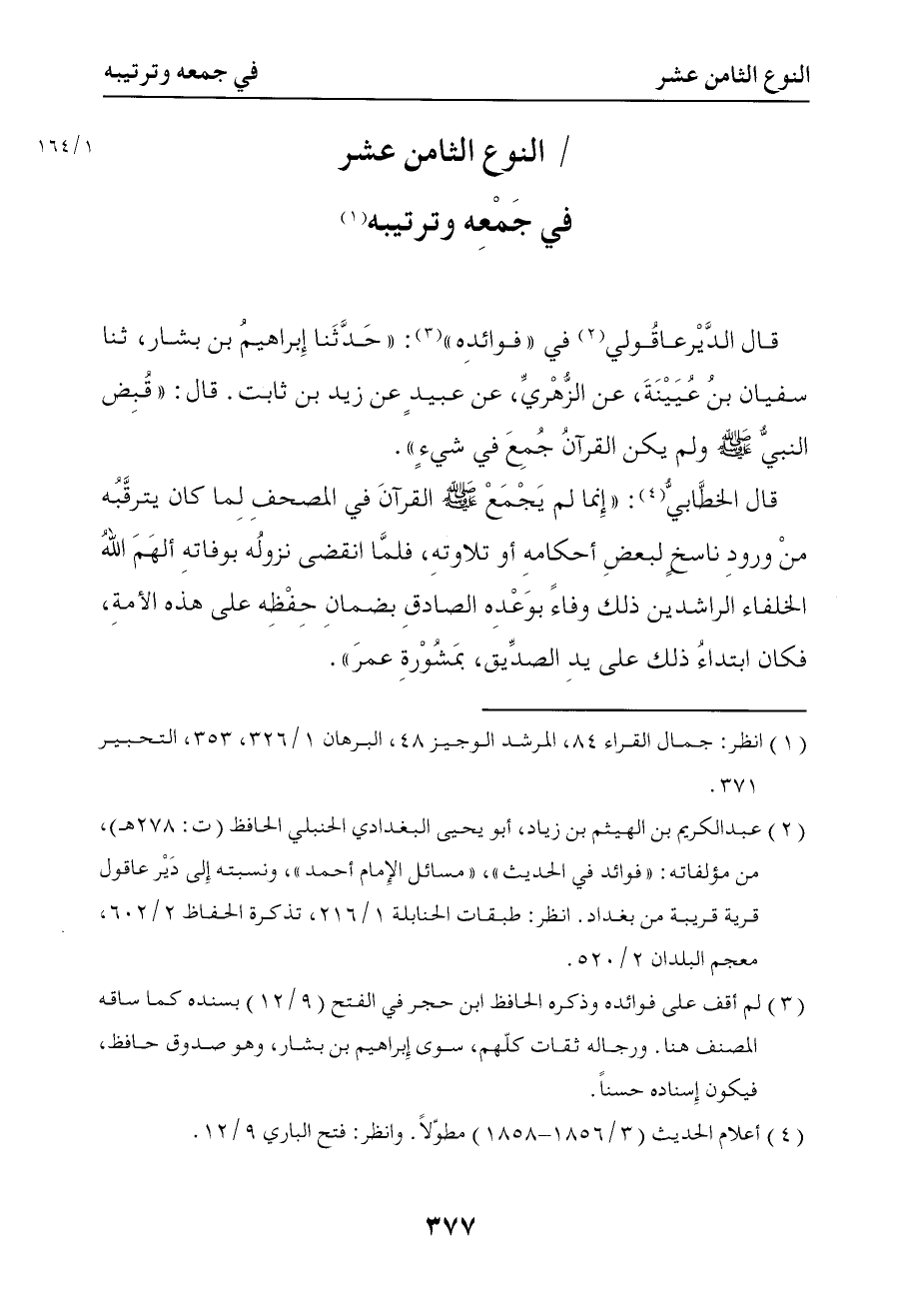 745 قال الديرعاقولي في فوائده حدثنا إبراهيم بن بشار حدثنا سفيان بن عيينة عن الزهري عن عبيد عن زيد بن ثابت قال قبض النبي صلى الله عليه وسلم ولم يكن القرآن جمع في شيء