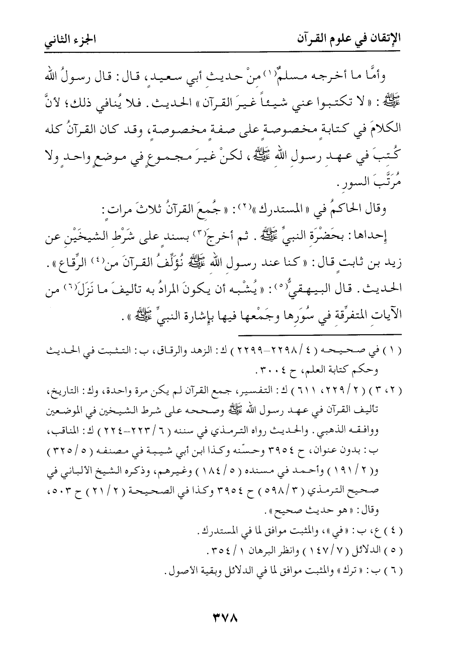 وأما ما أخرجه مسلم من حديث أبي سعيد قال قال رسول الله صلى الله عليه وسلم لا تكتبوا عني شيئا غير القرآن . . . الحديث فلا ينافي ذلك لأن الكلام في كتابة مخصوصة على صفة مخصوصة وقد كان القرآن كتب كله في عهد رسول الله صلى الله عليه وسلم لكن غير مجموع في موضع واحد ولا مرتب السور القول في جمع القرآن ثلاث مرات