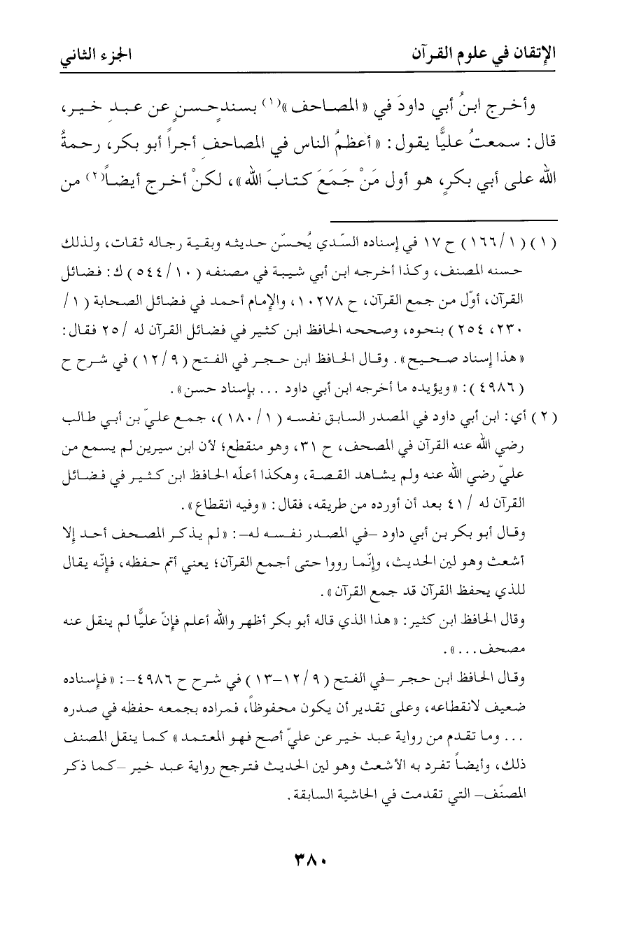 750 وأخرج ابن أبي داود في المصاحف بسند حسن عن عبد خير قال سمعت عليا يقول أعظم الناس في المصاحف أجرا أبو بكر رحمة الله على أبي بكر هو أول من جمع كتاب الله لكن أخرج أيضا من