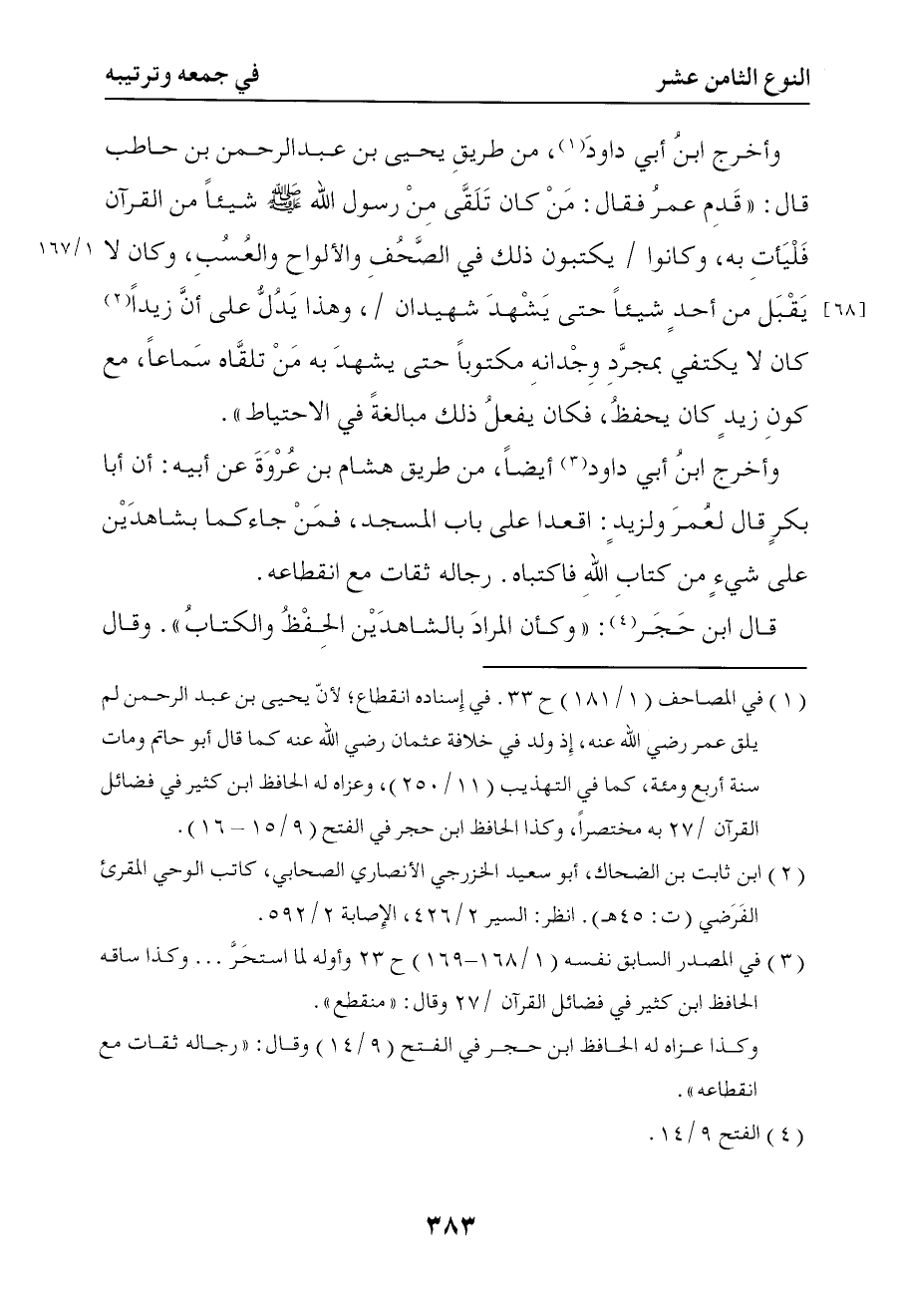756 وأخرج ابن أبي داود أيضا من طريق هشام بن عروة عن أبيه أن أبا بكر قال لعمر ولزيد اقعدا على باب المسجد فمن جاءكما بشاهدين على شيء من كتاب الله فاكتباه رجاله ثقات مع انقطاعه