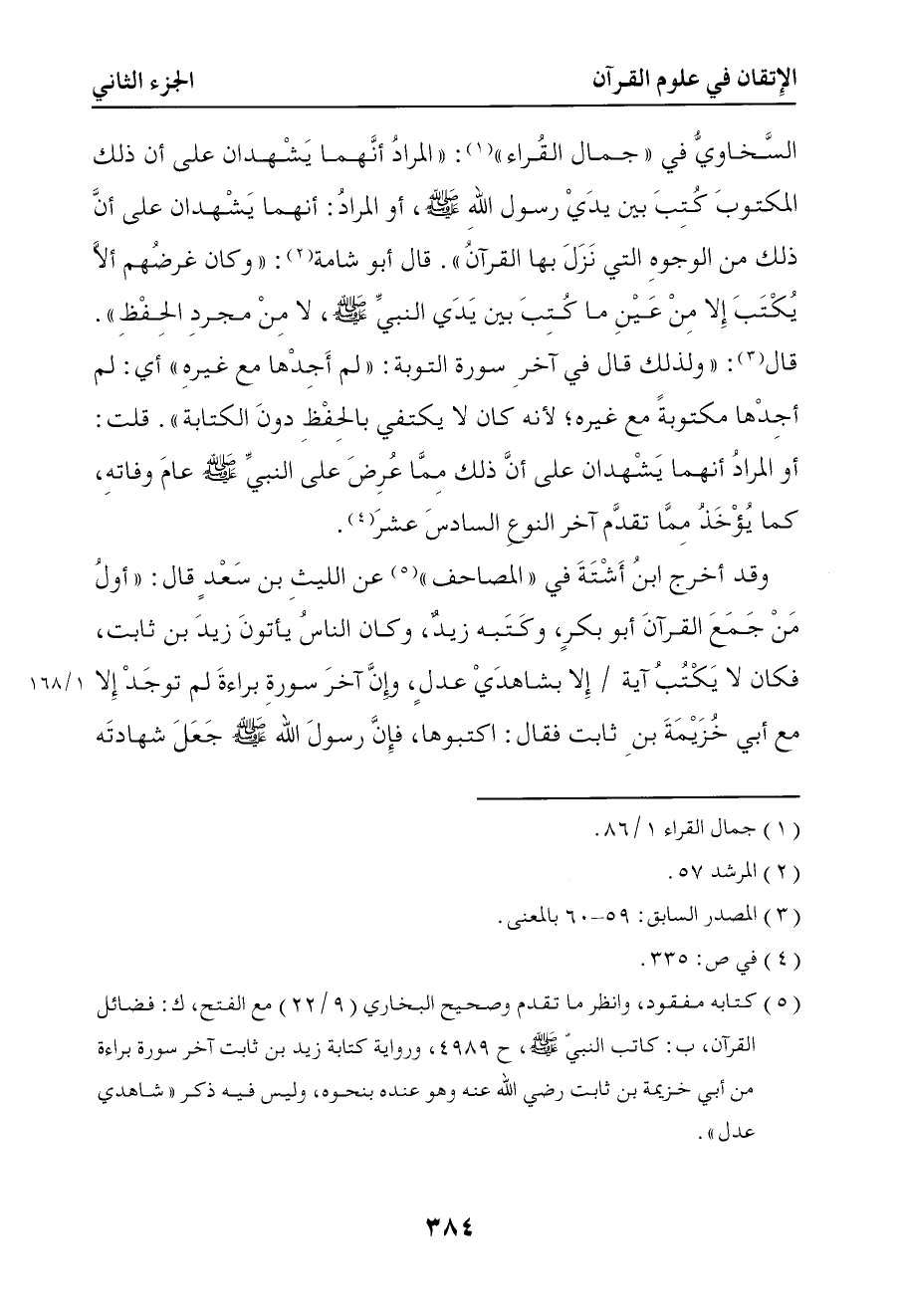 761 وقد أخرج ابن اشته في المصاحف عن الليث بن سعد قال أول من جمع القرآن أبو بكر وكتبه زيد وكان الناس يأتون زيد بن ثابت فكان لا يكتب آية إلا بشاهدي عدل وأن آخر سورة براءة لم توجد إلا مع خزيمة بن ثابت فقال أكتبوها فإن رسول الله صلى الله عليه وسلم جعل شهادته