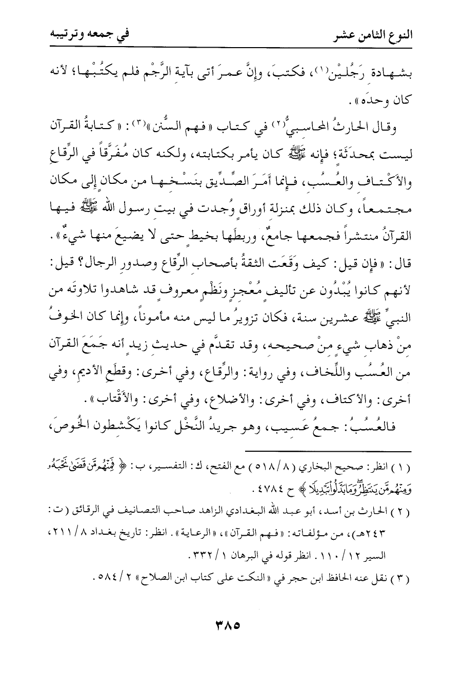 762 وقال الحارث المحاسبي في كتاب فهم السنن كتابة القرآن ليست بمحدثة فإنه صلى الله عليه وسلم كان يأمر بكتابته ولكنه كان مفرقا في الرقاع والأكتاف والعسب فإنما أمر الصديق بنسخها من مكان إلى مكان مجتمعا وكان ذلك بمنزلة أوراق وجدت في بيت رسول الله صلى الله عليه وسلم فيها القرآن منتشر فجمعها جامع وربطها بخيط حتى لا يضيع منها شيء