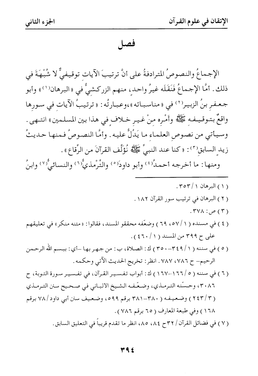 779 الإجماع والنصوص المترادفة على أن ترتيب الآيات توقيفي لا شبهة في ذلك وأما الإجماع فنقله غير واحد منهم الزركشي في البرهان وأبو جعفر بن الزبير في مناسباته وعبارته ترتيب الآيات في سورها واقع بتوقيفه صلى الله عليه وسلم وأمره من غير خلاف في هذا بين المسلمين انتهى