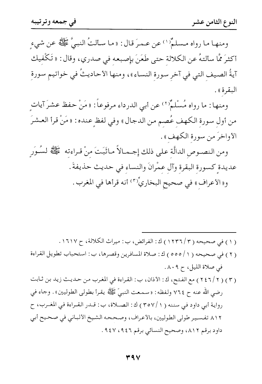 787 ومن النصوص الدالة على ذلك إجمالا ما ثبت من قراءته صلى الله عليه وسلم لسور عديدة كسورة البقرة وآل عمران والنساء في حديث حذيفة والأعراف في صحيح البخاري أنه قرأها في المغرب