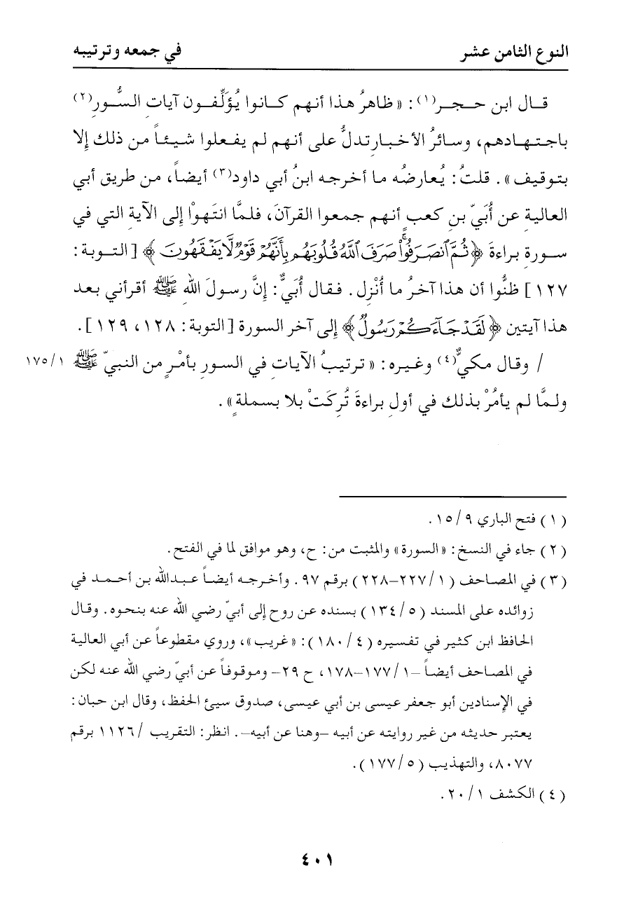 799 قلت يعارضه ما أخرجه ابن أبي داود أيضا من طريق أبي العالية عن أبي بن كعب أنهم جمعوا القرآن فلما انتهوا إلى الآية التي في سورة براءة { ثم انصرفوا صرف الله قلوبهم بأنهم قوم لا يفقهون } ظنوا أن هذا آخر ما أنزل فقال أبي إن رسول الله صلى الله عليه وسلم أقرأني بعد هذا آيتين { لقد جاءكم رسول } إلى آخر السورة