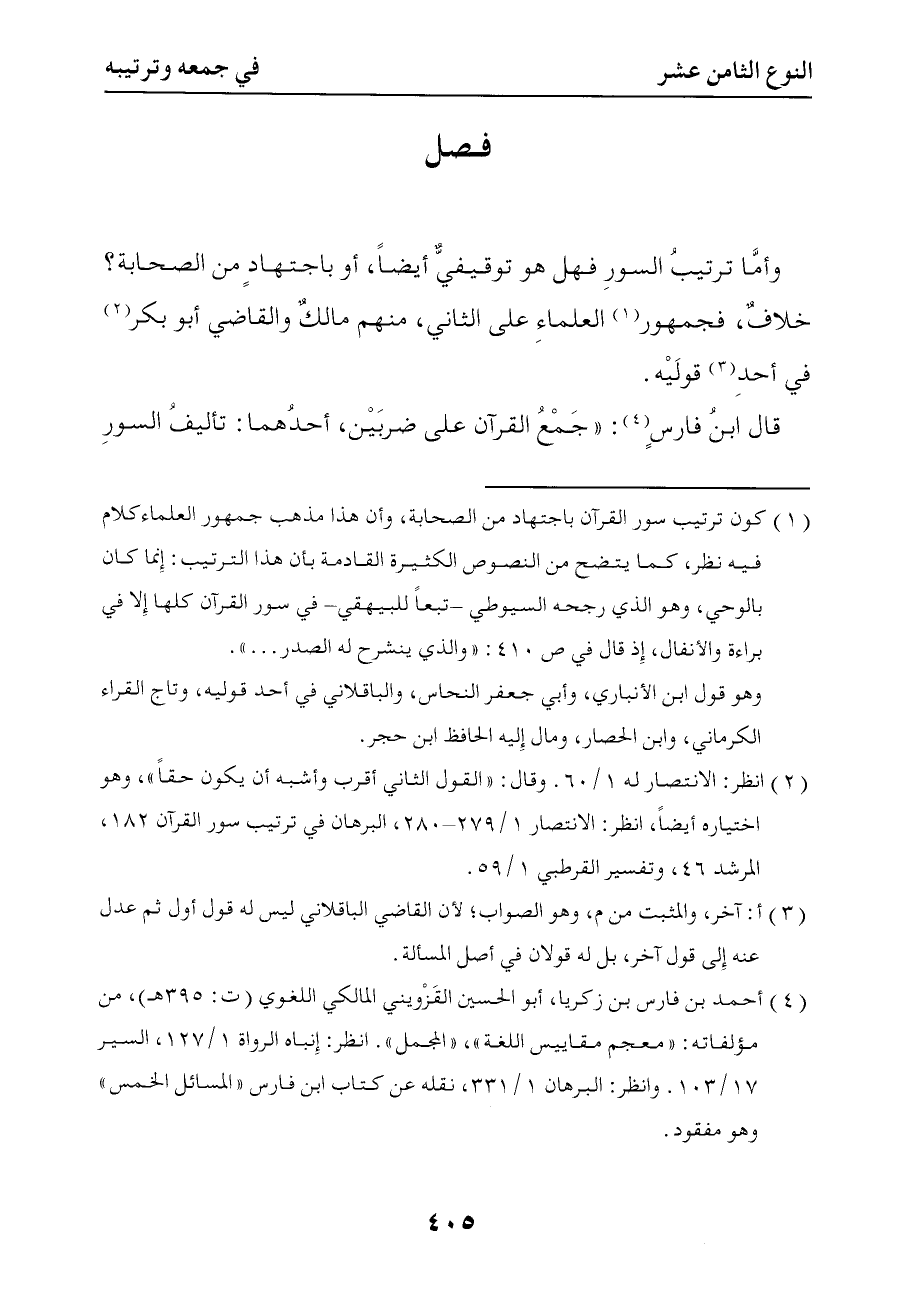 806 وأما ترتيب السور فهل هو توقيفي أيضا أو هو باجتهاد من الصحابة خلاف فجمهور العلماء على الثاني منهم مالك والقاضي أبو بكر في قوليه