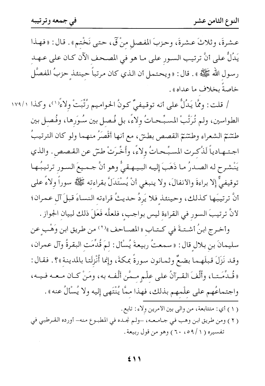 821 قلت ومما يدل على أنه توقيفي كون الحواميم رتبت ولاء وكذا الطواسين ولم ترتب المسبحات ولاء بل فصل بين سورها وفصل بين طسم الشعراء وطسم القصص بطس مع أنها أقصر منهما ولو كان الترتيب اجتهاديا لذكرت المسبحات ولاء وأخرت طس عن القصص والذي ينشرح له الصدر ما ذهب إليه البيهقي وهو أن جميع السور ترتيبها توقيفي إلا براءة والأنفال ولا ينبغي أن يستدل بقراءته صلى الله عليه وسلم سورا ولاء على أن ترتيبها كذلك وحينئذ فلا يرد حديث قراءته النساء قبل آل عمران لأن ترتيب السور في القراءة ليس بواجب فلعله فعل ذلك لبيان الجواز