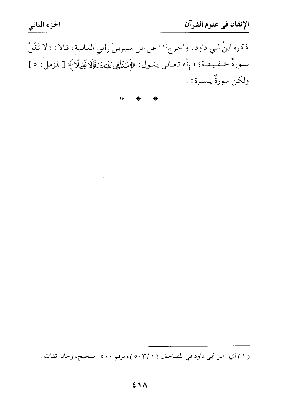 831 وأخرج عن ابن سيرين وأبي العالية قالا لا تقل سورة خفيفة فإنه تعالى يقول { سنلقي عليك قولا ثقيلا } ولكن سورة يسيرة