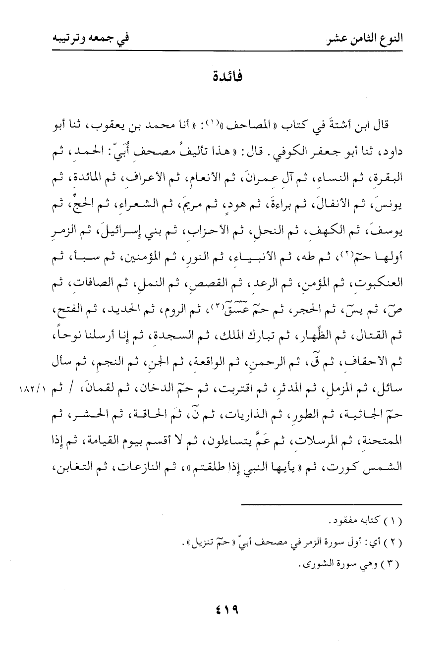 832 قال ابن أشتة في كتاب المصاحف أنبأنا محمد بن يعقوب حدثنا أبو داود حدثنا أبو جعفر الكوفي قال هذا تأليف مصحف أبي الحمد ثم البقرة ثم النساء ثم آل عمران ثم الأنعام ثم الأعراف ثم المائدة ثم يونس ثم الأنفال ثم براءة ثم هود ثم مريم ثم الشعراء ثم الحج ثم يوسف ثم الكهف ثم النحل ثم الأحزاب ثم بني إسرائيل ثم الزمر أولها حم ثم طه ثم الأنبياء ثم النور ثم المؤمنون ثم سبأ ثم العنكبوت ثم المؤمن ثم الرعد ثم القصص ثم النمل ثم الصافات ثم ص ثم يس ثم الحجر ثم حمعسق ثم الروم ثم الحديد ثم الفتح ثم القتال ثم الظهار ثم { تبارك } الملك ثم السجدة ثم { إنا أرسلنا نوحا } ثم الأحقاف ثم ق ثم { الرحمن } ثم الواقعة ثم الجن ثم النجم ثم { سأل سائل } ثم المزمل ثم المدثر ثم { اقتربت } ثم حم الدخان ثم لقمان ثم حم الجاثية ثم الطور ثم الذاريات ثم ن ثم الحاقة ثم الحشر ثم الممتحنة ثم المرسلات ثم { عم يتساءلون } ثم { لا أقسم بيوم القيامة } ثم { إذا الشمس كورت } ثم { يا أيها النبي إذا طلقتم النساء } ثم النازعات ثم التغابن
