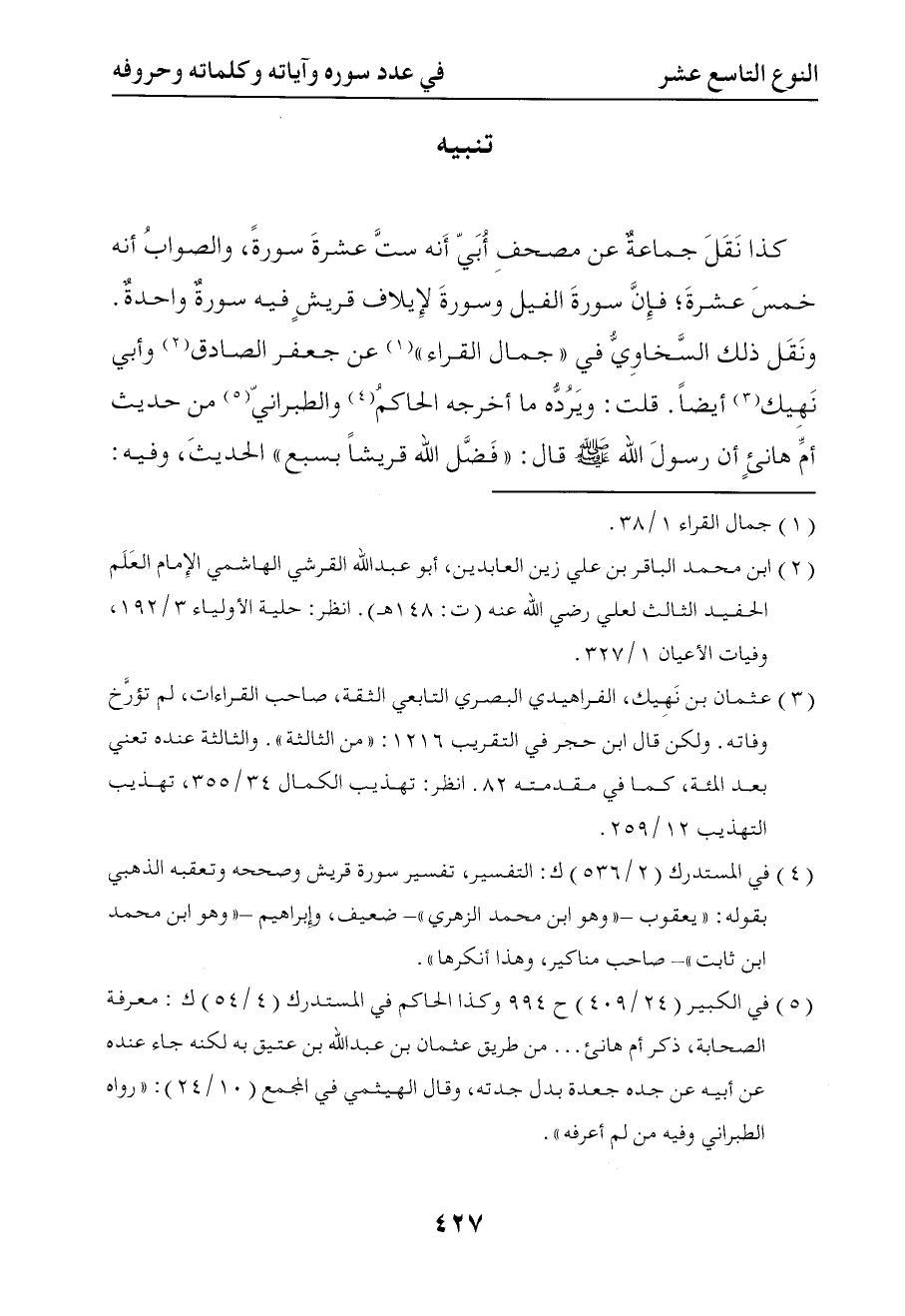 852 كذا نقل جماعة عن مصحف أبي أنه ست عشرة سورة والصواب أنه خمس عشرة فإن سورة الفيل وسورة لإيلاف قريش فيه سورة واحدة ونقل ذلك عن السخاوي في جمال القراء عن جعفر الصادق وأبي نهيك أيضا