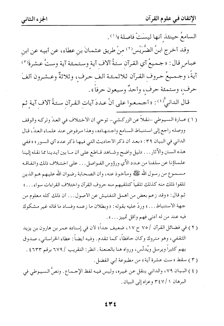 870 وقد أخرج ابن الضريس من طريق عثمان بن عطاء عن أبيه عن ابن عباس قال جميع آي القرآن ستة آلاف وستمائة وست عشرة آية وجميع حروف القرآن ثلاثمائة ألف حرف وثلاثة وعشرون ألف حرف وستمائة حرف وواحد وسبعون حرفا