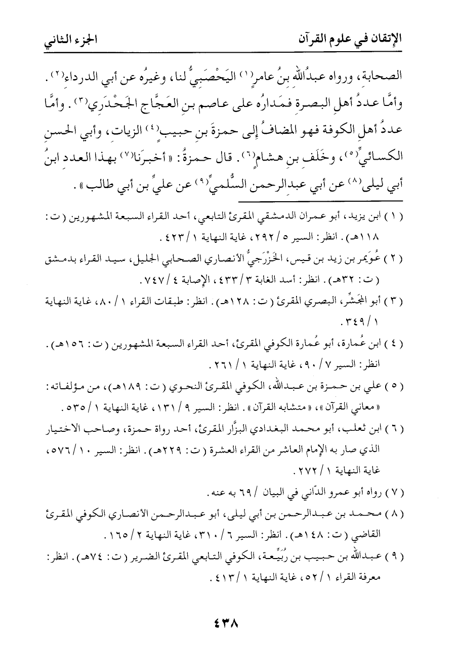 الصحابة ورواه عبد الله بن عامر اليحصبي لنا وغيره عن أبي الدرداء وأما عدد أهل البصرة فمداره على عاصم بن العجاج الجحدري وأما عدد أهل الكوفة فهو المضاف إلى حمزة بن حبيب الزيات وأبي الحسن الكسائي وخلف بن هشام قال حمزة أخبرنا بهذا العدد ابن أبي ليلى عن أبي عبد الرحمن السلمي عن علي بن أبي طالب