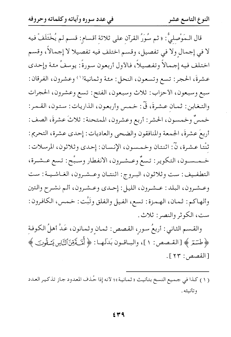 875 قال الموصلي ثم سور القرآن على ثلاثة أقسام قسم لم يختلف فيه لا في إجمال ولا في تفصيل وقسم اختلف فيه تفصيلا لا إجمالا وقسم اختلف فيه جمالا وتفصيلا